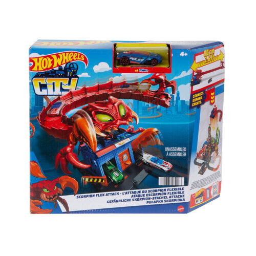 Take on thrilling challenges with the Mattel Hot Wheels Toy Car Track Set City Scorpion Flex Attack. This set includes a 1:64 scale police vehicle and connects to other Hot Wheels sets, offering dynamic play for kids aged 4 and up.